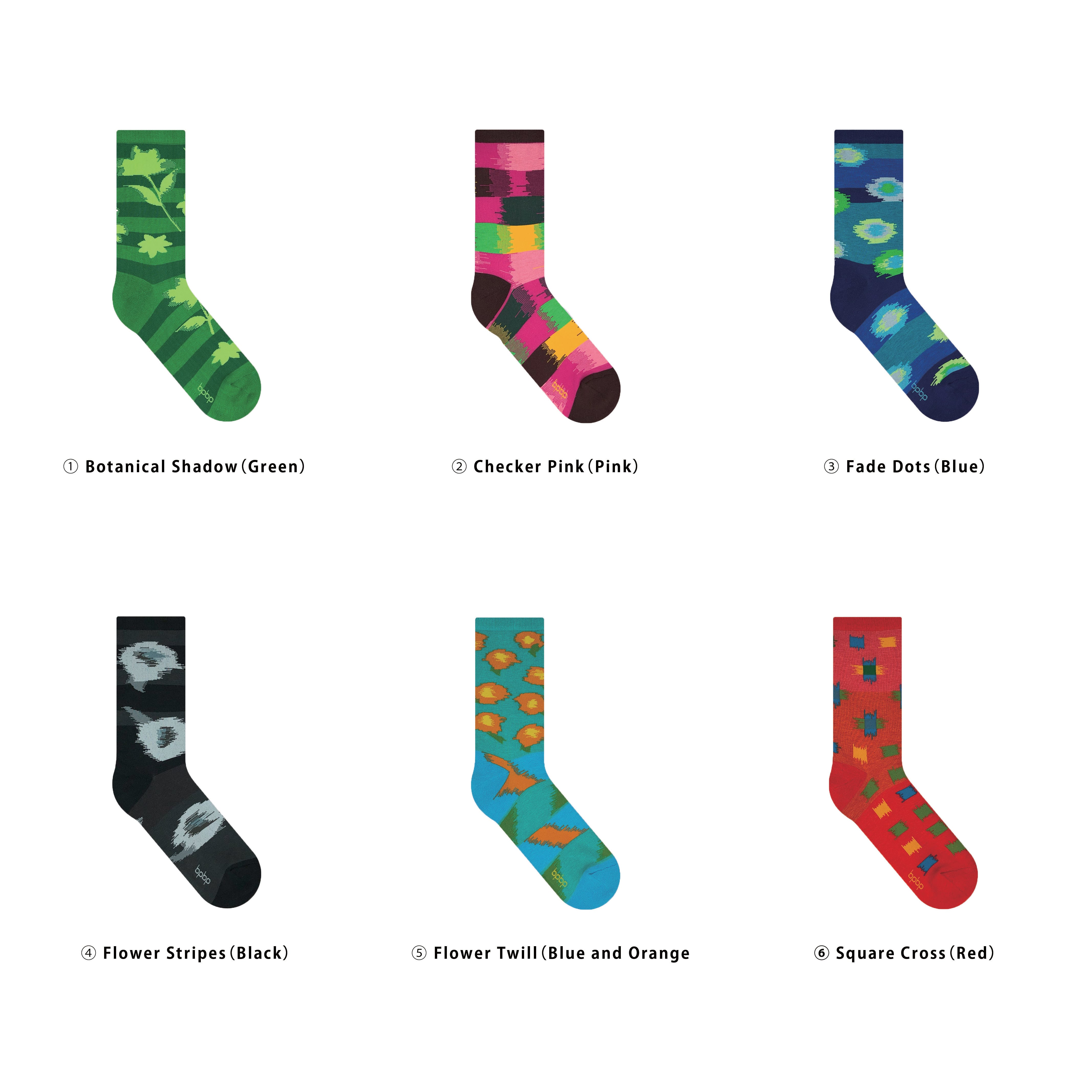 The lineup titled “IKAT STEPS” is a series of socks inspired by the act of walking in socks, the process of connecting tradition to contemporary lifestyles, and the movement of kasuri yarns—expressed as the subtle misalignment of patterns.