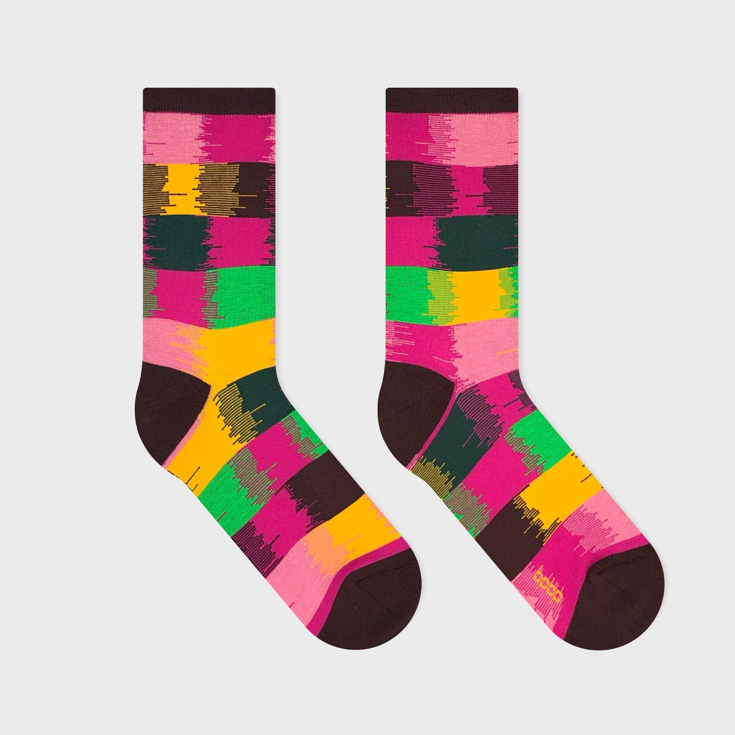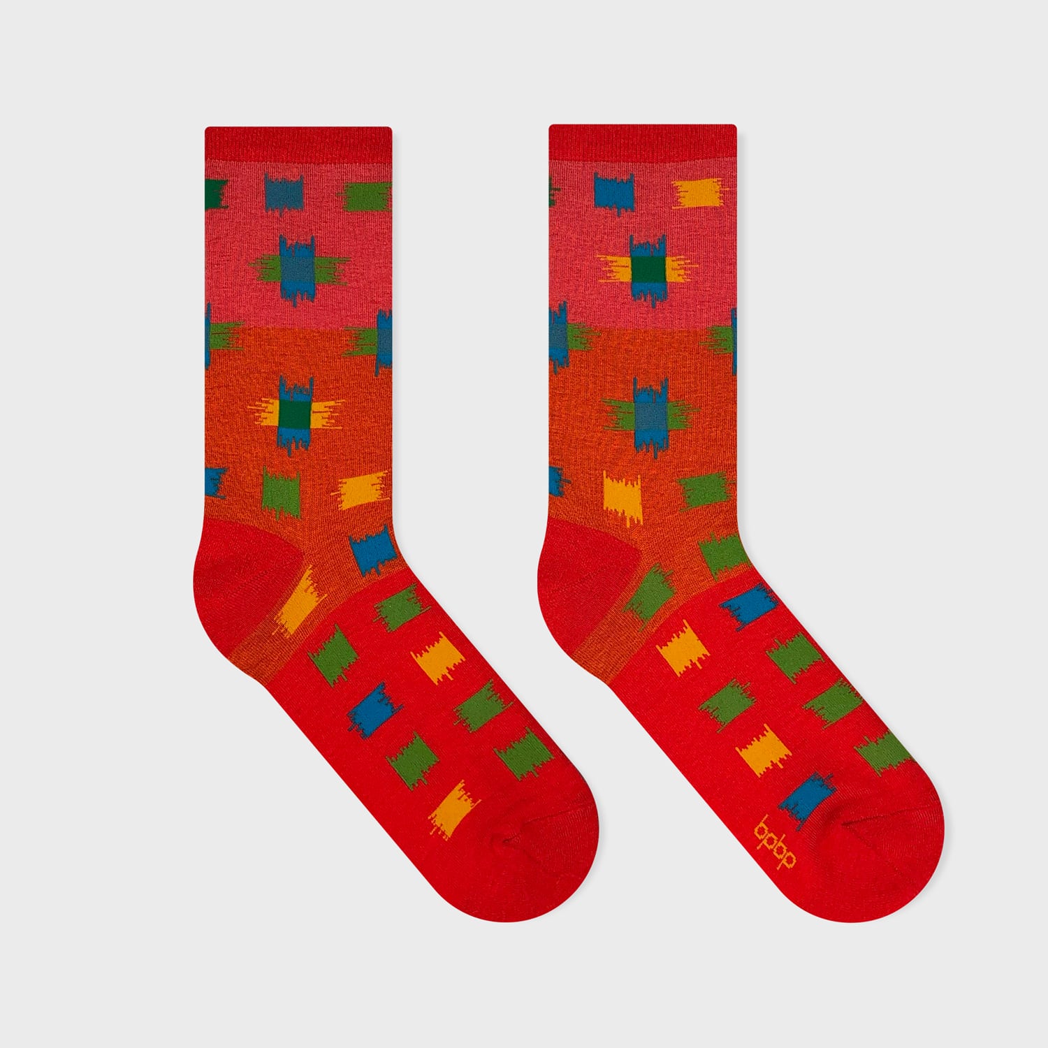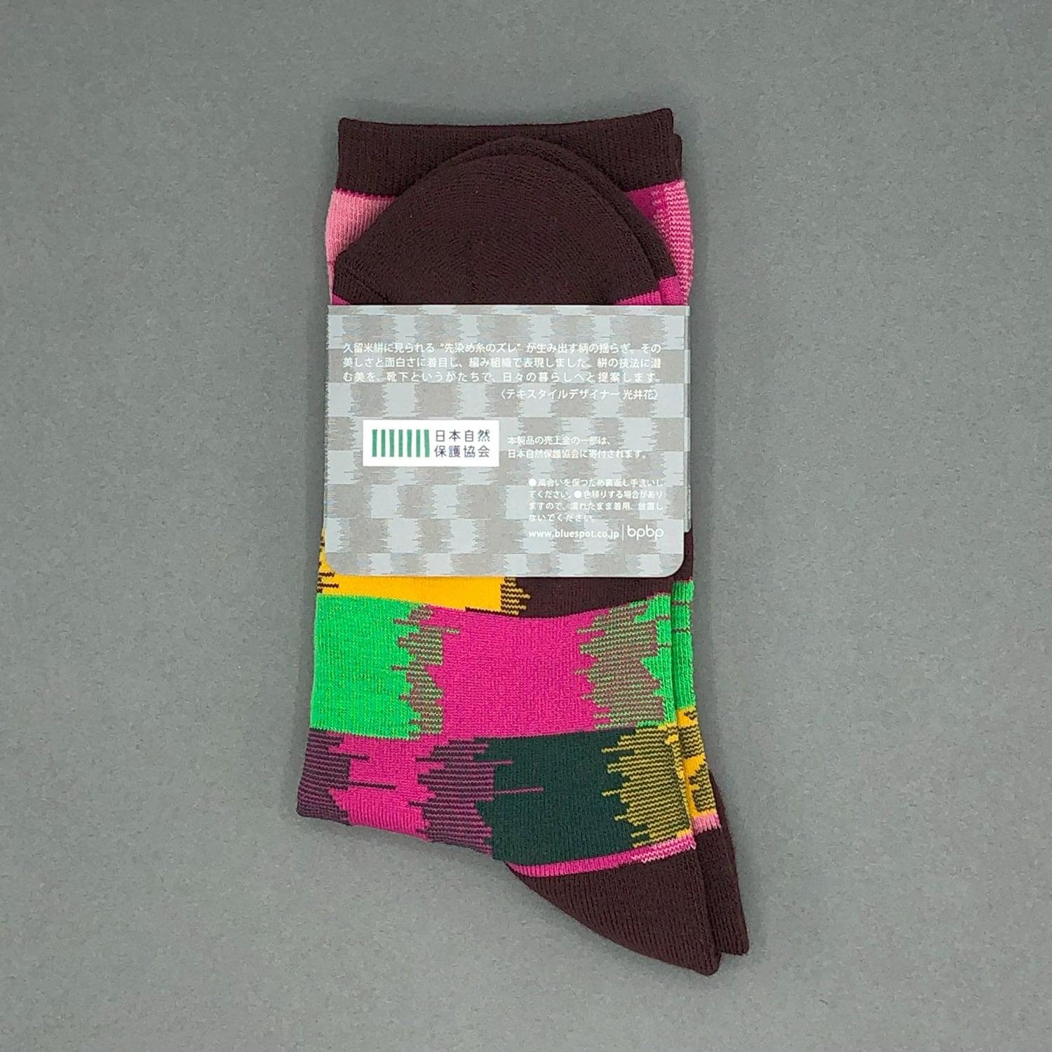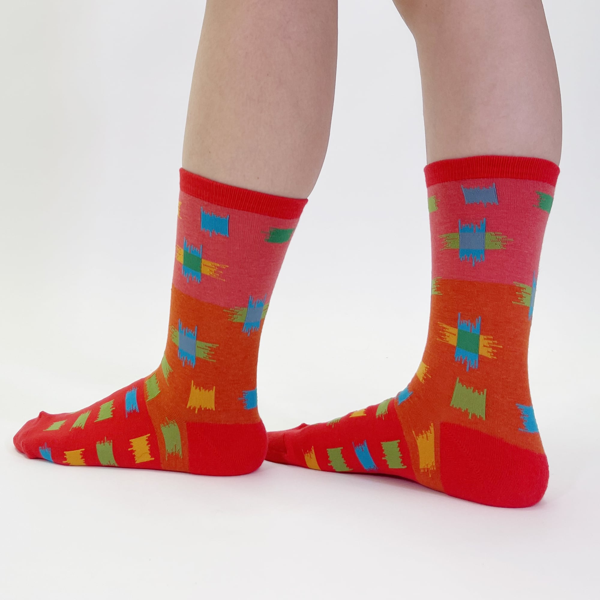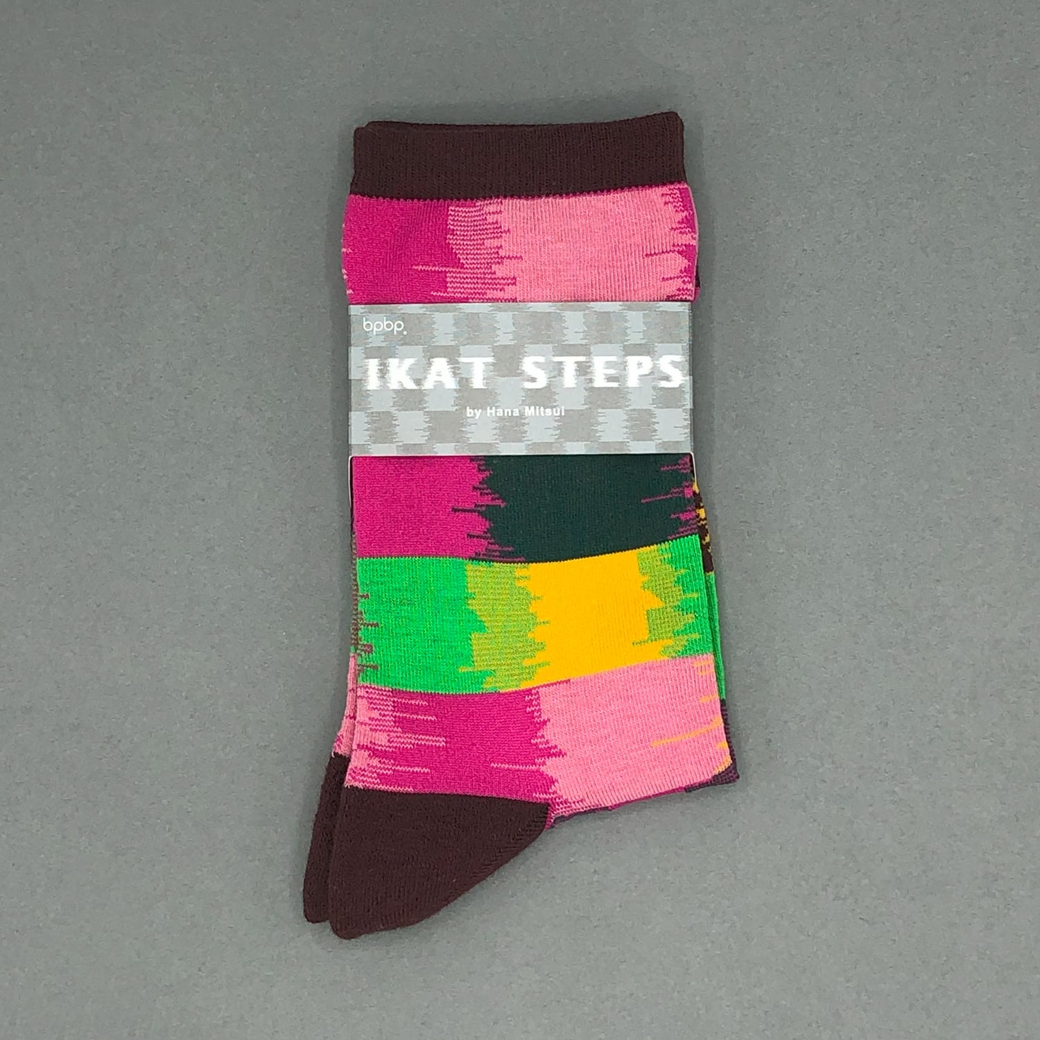 『IKAT STEPS』と題されたラインナップは、靴下を履いて歩く事や伝統から現代のライフスタイルをつなぐ歩みだったり、絣糸の動き(柄のズレ)のような意味合いが込められたソックスシリーズです。